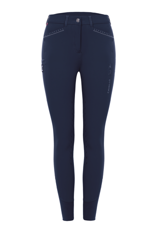 Sportieve, elegante rijbroek van een nieuw type softshell-materiaal. Het materiaal is zeer comfortabel om te dragen en kan het hele jaar door gedragen worden. Gevormde tailleband met riemlussen en kleine kristallen op de riemlussen aan de achterkant. Twee bijgevoegde flappen en een Cavallo siliconen full grip geven de billen een geweldige vorm. Royale gsm-zak op de rechterdij met Ingrid Klimke & Cavallo-logo. Twee voorzakken met kleine glinsterende kristallen en zilveren bies. Kunstwerk Klimke & Cavallo in zilver op de linker zijnaad.