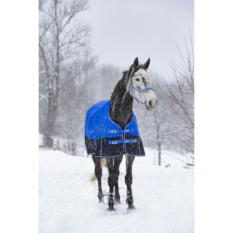 Waterdichte en ademende buitendeken van 1200 denier 3000/3000 Ripstop polyester met getapete naden, nylon voering. High Neck. Voorzien van een zeer grote waterdichte staartflap met geïntegreerde reflecterende tape, plooien, lage kruissingels en dijbeenbanden. Borstsluiting door snelsluiting, versterkt door klittenband, met maataanduiding op rubberen patch