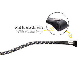 De frontriem "Hopscotch" heeft kleine witte en marineblauwe strasssteentjes in een elegante setting. Het bijzondere: De frontriem heeft een elastische lus aan de zijkanten, waardoor de frontriem gebruikt kan worden voor smalle maar ook voor brede kopstukken zoals weymouth hoofdstellen. Bovendien ligt het elastische materiaal vlakker op het paardenhoofd en leidt daardoor tot minder druk op de zijkant van het hoofd.
