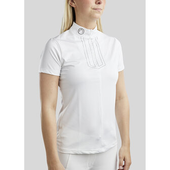Showshirt van Montar met verborgen rits. Het showshirt heeft een opstaand kraagje met een Montar logo. Rondom de verborgen rits is het showshirt afgewerkt met mooie strass steentjes.